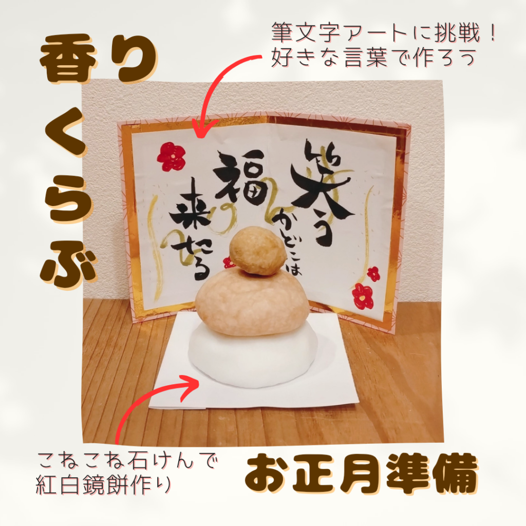 12月(年末)は、お正月飾りをこねこね石鹸で鏡餅を作ります♪