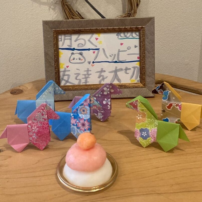 来年の干支である「午」は、折り紙を使って制作。和柄の折り紙でとても素敵な作品になりました。